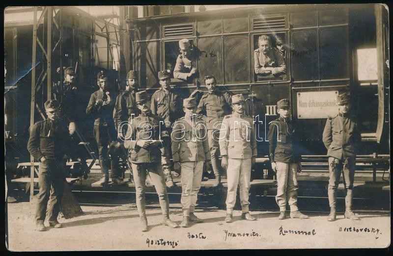Beschreibung: 1910 Katonák vonat előtt indulásra készen, fotólap Schäffer műterméből, 14×9 cm