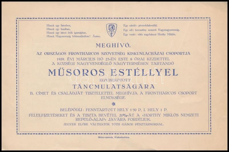 Beschreibung: 1939 Meghívó az Országos Frontharcos Szövetség Kiskunlacházai Csoportjának műsoros táncestélyére