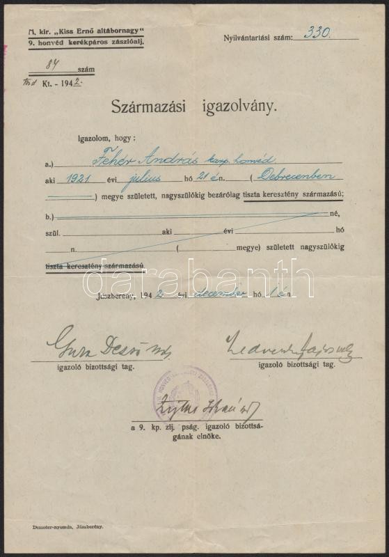 Beschreibung: 1942 Debrecen, M. Kir. "Kiss Ernő altábornagy" 9. honvéd kerékpáros zászlóalj karpaszományos honvédjének származási igazolása