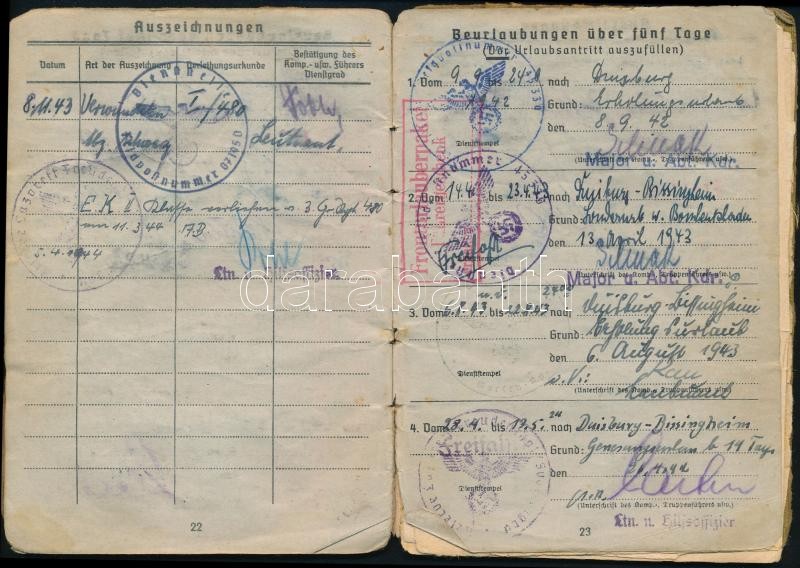 1942 Német zsoldkönyv, számos bejegyzéssel https://www.darabanth.com/de/323-Fernauktion/323.0/Andere-Sammelgebiete/Militaria~500025/1942-Nemet-zsoldkonyv-szamos-bejegyzessel~II1797025