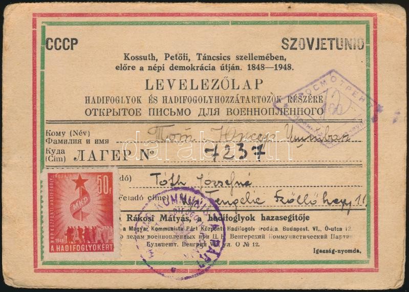 1948 Hadifogoly levelezőlap, okmánybélyeggel https://www.darabanth.com/de/323-Fernauktion/323.0/Andere-Sammelgebiete/Militaria~500025/1948-Hadifogoly-levelezolap-okmanybelyeggel~II1793792