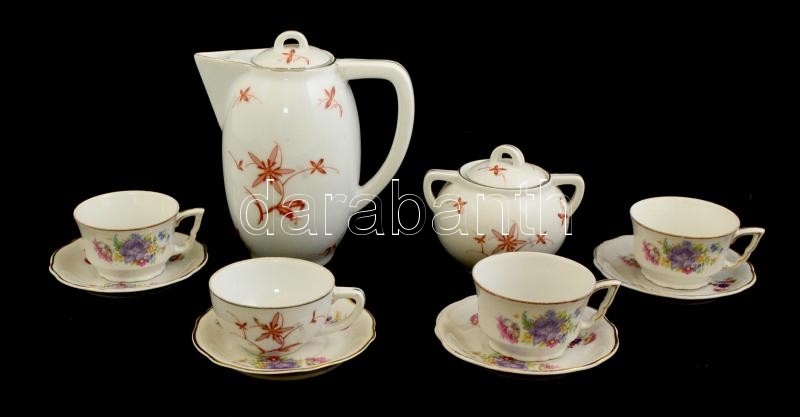 Beschreibung: Zsolnay mokkás készlet, matricás, jelzettek, lekopásokkal: 1 db cukortartó + 1 db kiöntő + 4 db csésze+alj, különböző méretben