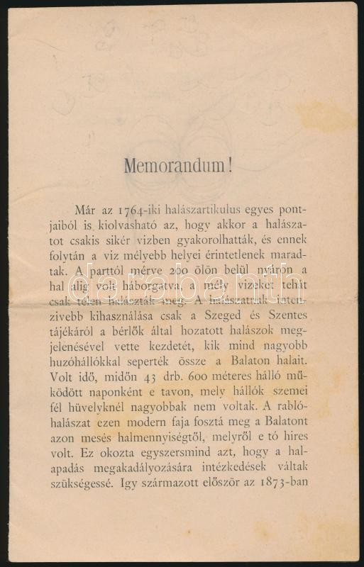 Beschreibung: cca 1895 Széchényi Ödön, a Balatoni Halászati Társulat elnökének memoranduma a Balatonért. 14p.