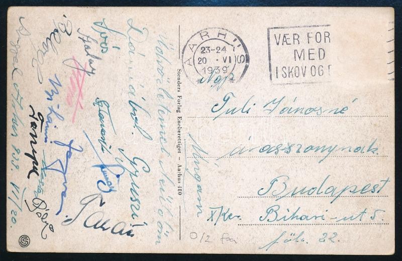 1939 Nemzeti S.C. labdarúgók által aláírt képeslap Aarhusból küldve, közte Fenyvesi, Szalay, Sztancsik, Takács, Bihari, Soos, Angyal, Tompa, Pálya