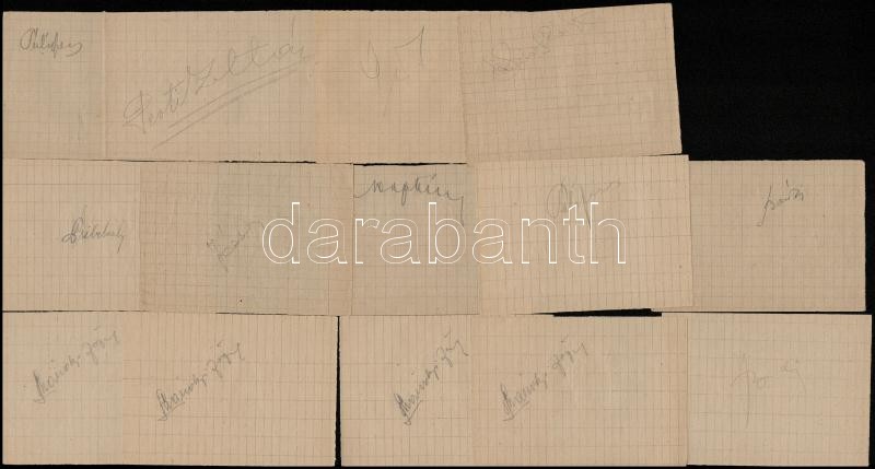 Beschreibung: A Diósgyőri Vasas csapattagjainak aláírása papírlapokon, 14 db