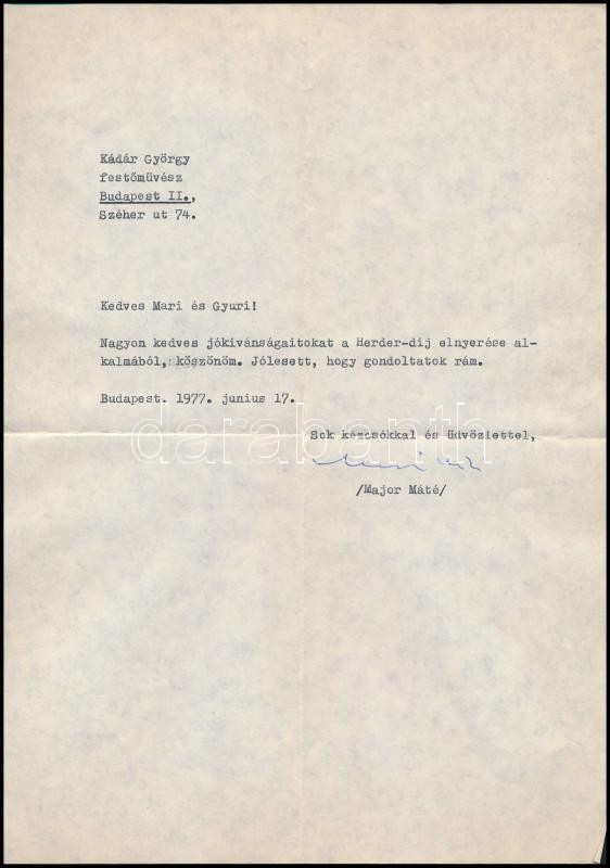 cca 1977 Major Máté (1904-1986) ) Kossuth-díjas magyar építész, egyetemi tanár, MTA-tag gépelt köszönő sorai és saját kezű aláírása a Herder-díj elnyerése kapcsán küldött üdvözlő sorokra, egy Kádár György (1912-2002) Kossuth-díjas festő, grafikus, főiskolai tanár és felesége részére küldött levélen.