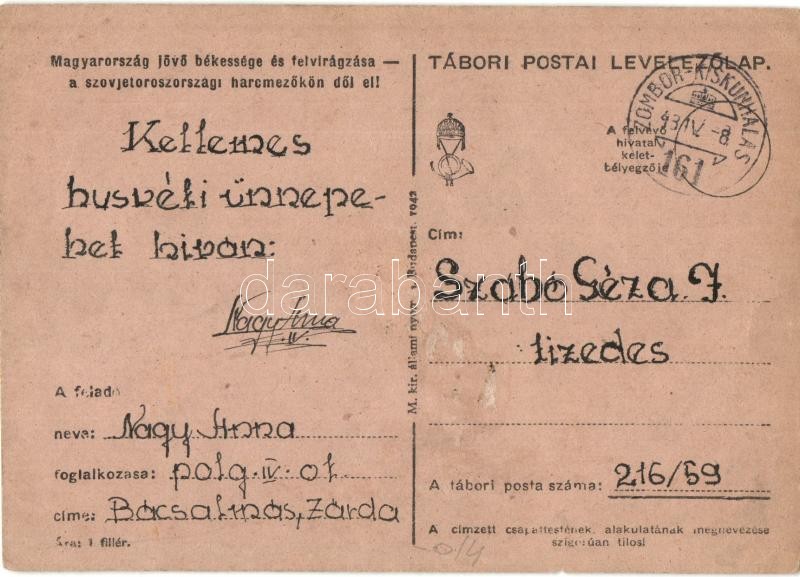 1943 Kellemes húsvéti ünnepeket kíván Nagy Anna IV. osztályos tanuló Szabó Géza tizedes részére. Tábori Postai Levelezőlap / WWII Hungarian hand-drawn military field post, Easter greeting to the front from a schoolgirl (EK)