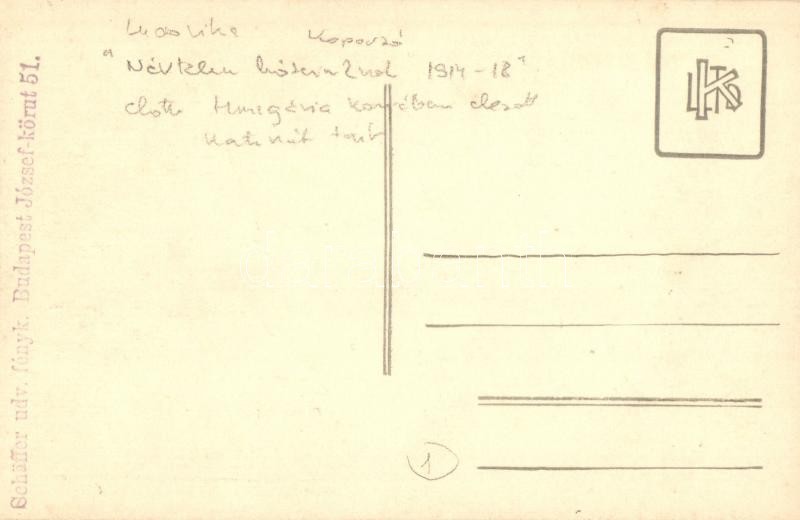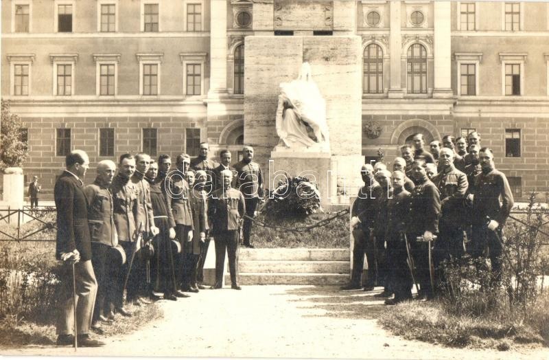 Magyar katonák a Ludovika előtt a Névtelen hősök 1914-18 emlékműnél (Hungária karjában elesett katonát tart, felette koporsó). Schäffer udv. fényképész felvétele / Hungarian soldiers at the Anonymous Heroes WWI memorial (Statue of Hungaria holds a dead soldier, above them a coffin). Schäffer photo