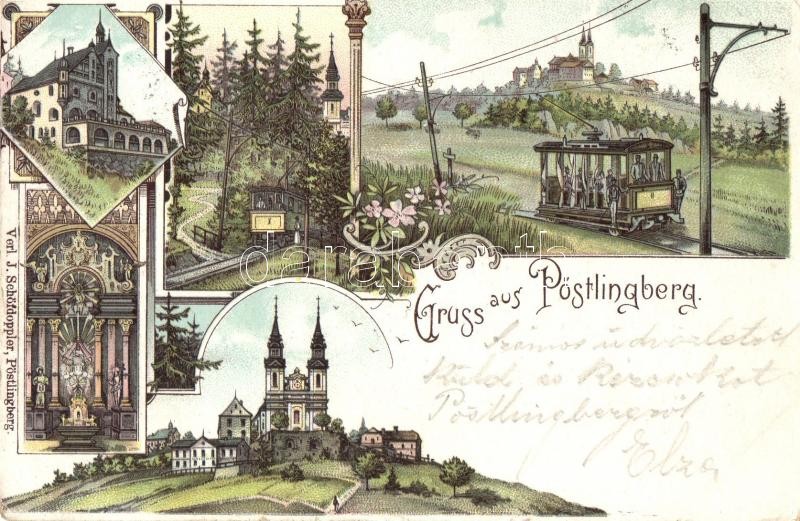 Beschreibung: 1901 Linz, Pöstlingberg, electric funicular, church interior, villa. Art Nouveau, floral, litho (EK)