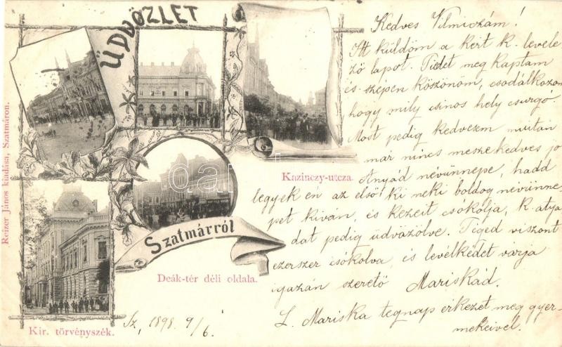Beschreibung: 1898 Szatmárnémeti, Szatmár, Satu Mare; Kazinczy utca, Deák tér, Kir. Törvényszék. Reizer János kiadása / street, square, court. Art Nouveau, floral (EK)