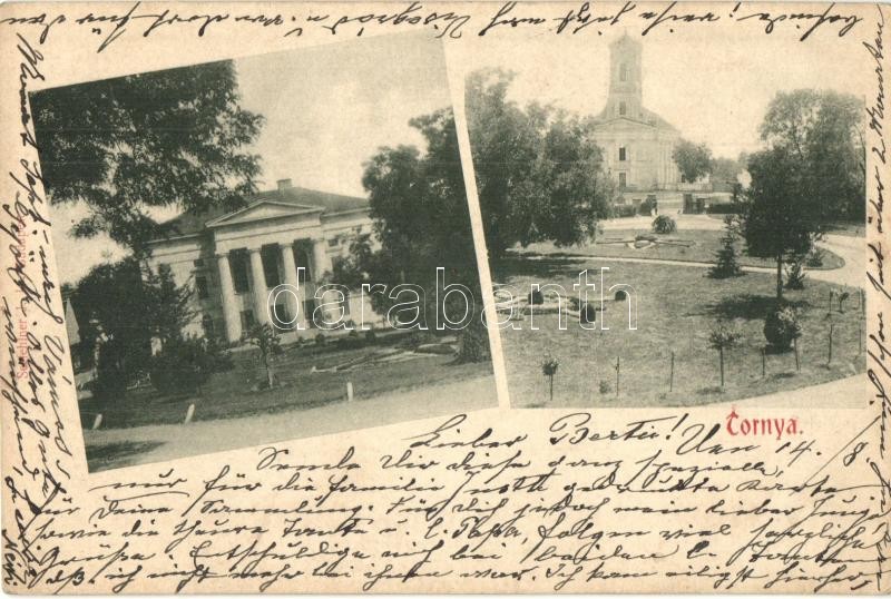 1900 Tornya, Pornya, Turnu; Marczibányi-kastély (Justh Gyula országgyűlési képviselő tulajdona volt, 1938-ban lerombolták), tér és templom. Seefehlner J. kiadása / castle (property of Gyula Justh Hungarian jurist, destroyed in 1938), church, square