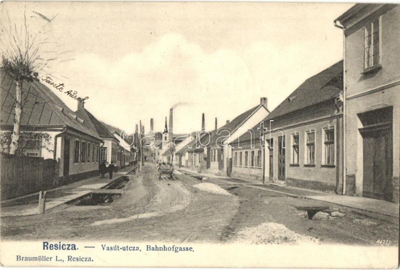 1906 Resica, Resita; Vasút utca háttérben a gyárkéményekkel. Braumüller L. kiadása / Bahnhofgasse / Railway street with the factory chimneys in the background