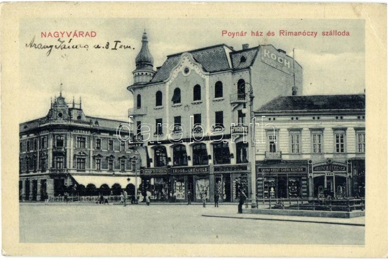1911 Nagyvárad, Oradea; Poynár ház, Rimanóczy szálloda, China ezüst gyári raktára, Jelinek Ferencz, Dénes B. Béla, Koch Testvérek, Erdős és Grünfeld és Dr. Kovács Gyula üzlete. Stern Béla 14. / square with hotel and shops, dentist