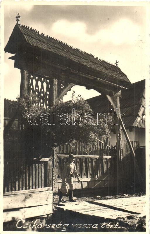 Beschreibung: 1940 Csíkszereda, Miercurea Ciuc; Csíkország visszatért, Székely kapu / Székely gate "1940 Csíkszereda visszatért" So. Stpl. Aladics photo