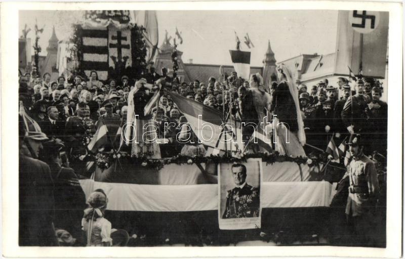 1940 Nagyvárad, Oradea; bevonulás, Horthy Miklós portré, honleányok, magyar címer és zászló, horogkereszt / entry of the Hungarian troops, Horthy portrait, compatriot women, Hungarian flag and coat of arms, swastika