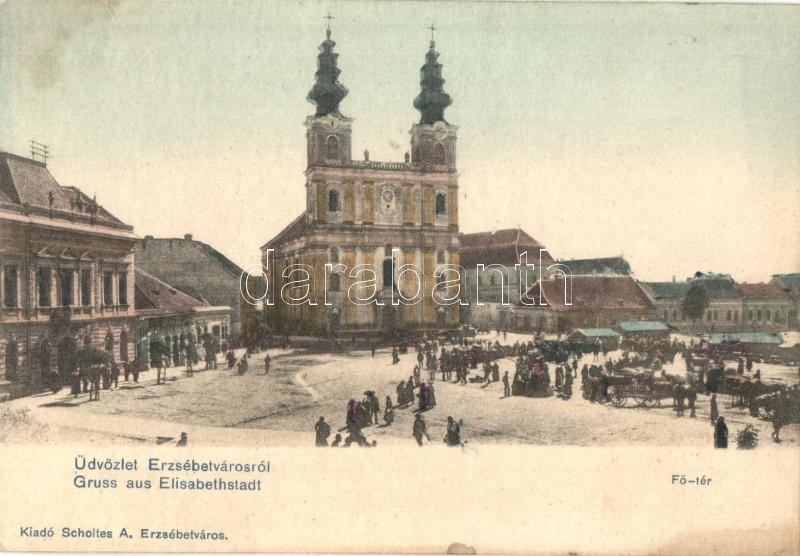 Beschreibung: Erzsébetváros, Dumbraveni, Elisabethstadt; Fő tér, piac, templom / main square, market, church (r)