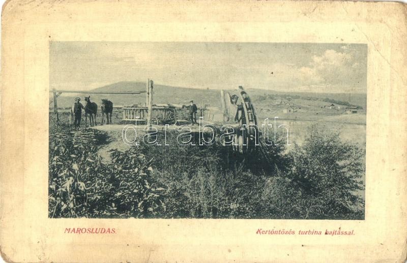 Beschreibung: Marosludas, Ludus; Kertöntözés turbina hajtással, W. L. Bp. 6405. kiadja Glück József / watering with turbine (EB)