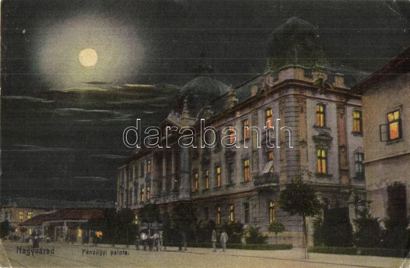 Nagyvárad, Oradea; Pénzügyi palota este / Finance palace at night (EK) https://www.darabanth.com/de/323-Fernauktion/323.0/Ansichtskarten/Siebenburgen~2500006/Nagyvarad-Oradea-Penzugyi-palota-este-Finance-palace-at-night-EK~II1793373