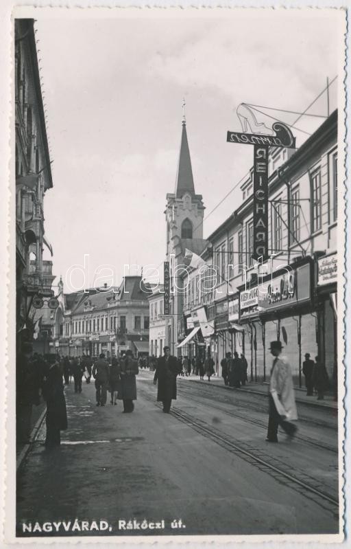 Nagyvárad, Oradea; Rákóczi út, Rechard Carmen cipőraktára, Pataky, Klein Hugó látszerész, Palotai Mihály, Hackmayer úri szabóság és Petri üzlete, Japport cukrászda / street view with shops and confectionery. photo
