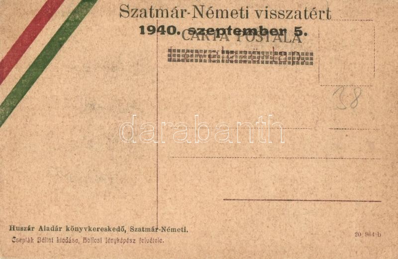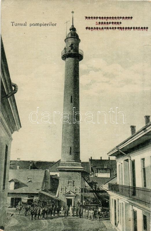 Szatmárnémeti, Szatmár, Satu Mare; Turnul pompierilor / Tűzoltó kongresszusi emlék 1908-ból, Tűzoltó őrtorony, istálló, tűzoltók, létra. Cseplák Bálint kiadása, Hollósi fényképész felvétele. Hátoldalon magyar zászló és visszatért felülbélyegzés / Memorial postcard from the Fire Fighting Congress, firefighter watch tower, firefighters, stable (EK)