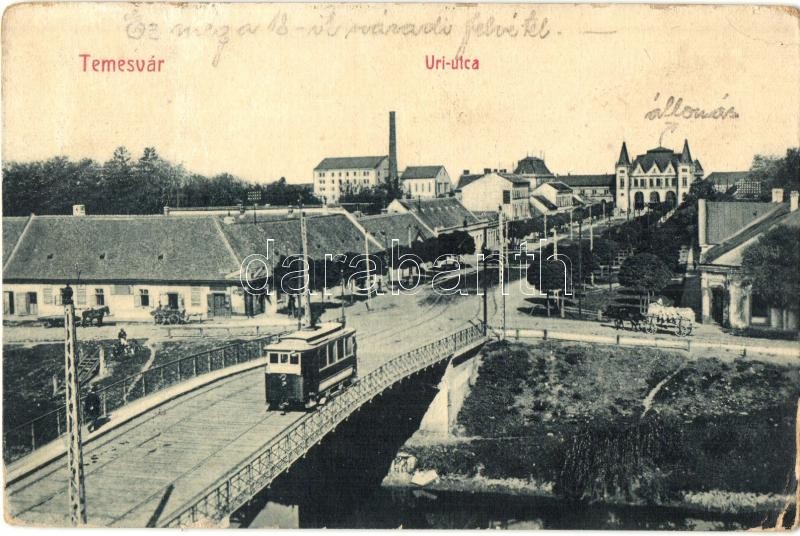 Temesvár, Timisoara; Úri utca, híd, villamos, vasútállomás a háttérben, üzletek. W. L. Bp. 2030. Kiadja Gerő Manó / street view, bridge, tram, railway station, shops (kopott sarkak / worn corners)