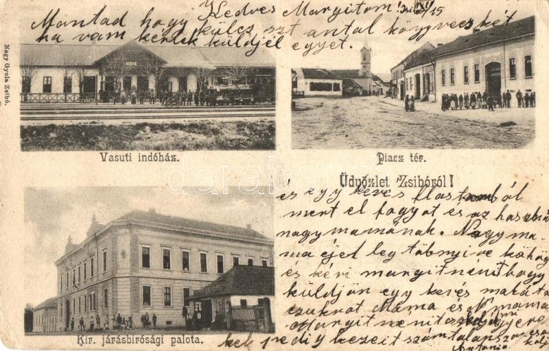 Beschreibung: Zsibó, Jibou; Vasúti indóház, vasútállomás, Piac tér, Kir. Járásbírósági palota. Nagy Gyula kiadása / railway station, market square, court palace (EK)