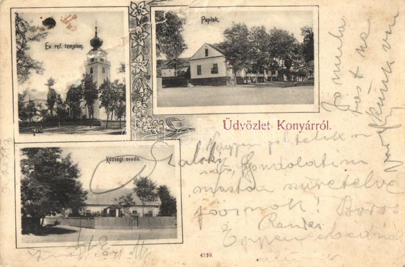 1908 Konyár, paplak, Református templom, Községi óvoda. Floral (r) https://www.darabanth.com/de/323-Fernauktion/323.0/Ansichtskarten/Ungarn~2500005/1908-Konyar-paplak-Reformatus-templom-Kozsegi-ovoda-Floral-r~II1794461