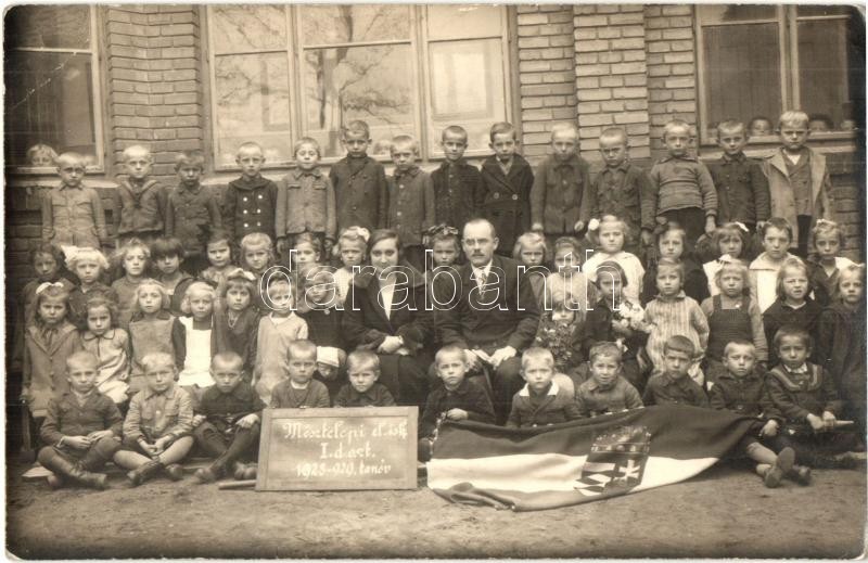 Felsőgalla (Tatabánya), Mésztelepi elemi iskola I. d. osztály 1928-1929-es tanévi csoportképe tanárral, címeres magyar zászlóval. Zsolnin István photo (EK)