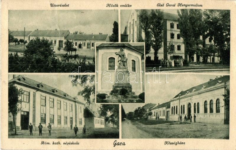 Beschreibung: Gara, Hősök emlékműve, Első Garai Hengermalom, községháza, Római katolikus népiskola