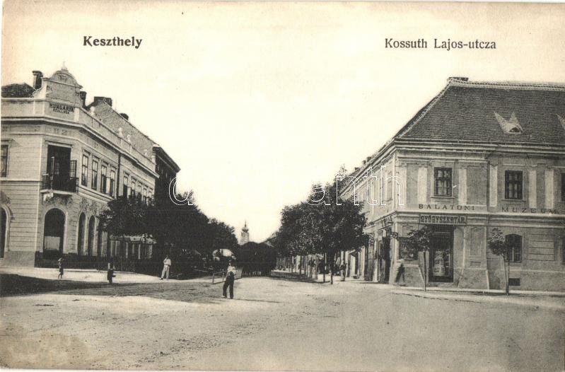 Beschreibung: Keszthely, Kossuth Lajos utca, Balatoni Múzeum, Gyógyszertár, Hungária szálloda (EK)