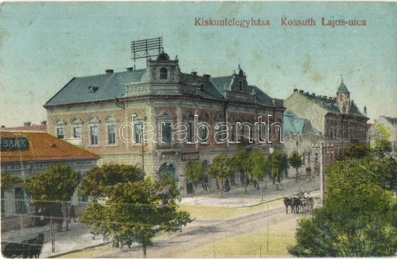 Beschreibung: Kiskunfélegyháza, Kossuth Lajos utca, bank, Kiss Lajos üzlete, kiadja Royko B.