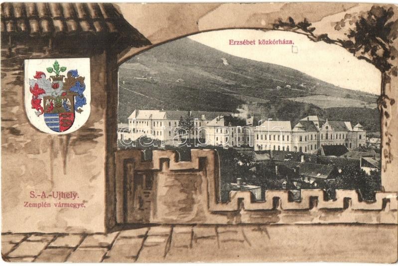 Sátoraljaújhely (Zemplén vármegye), Erzsébet közkórház. Címeres keret https://www.darabanth.com/de/323-Fernauktion/323.0/Ansichtskarten/Ungarn~2500005/Satoraljaujhely-Zemplen-varmegye-Erzsebet-kozkorhaz-Cimeres-keret~II1790735