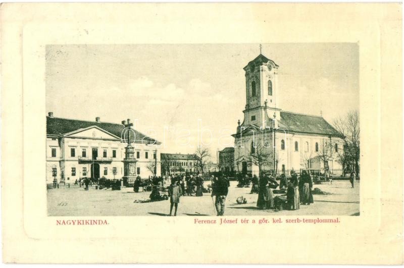 Nagykikinda, Kikinda; Ferenc József tér, Görögkeleti (ortodox) szerb templom, piaci árusok. W. L. Bp. 6628. / Franz Joseph square, Serbian Orthodox church, market vendors (EK)