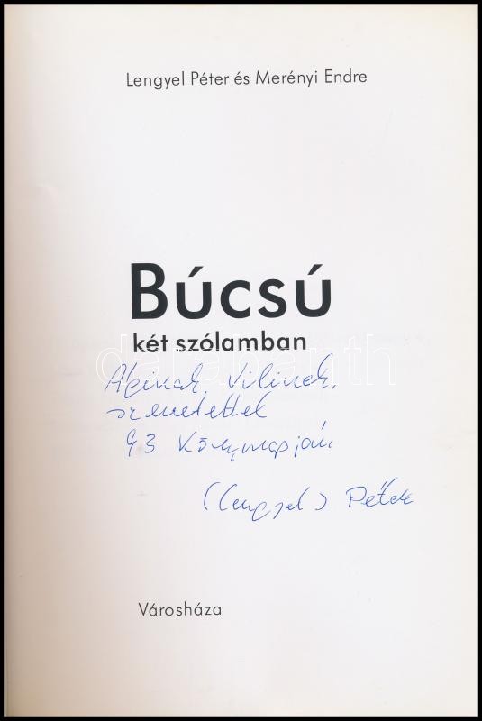 Lengyel Péter-Merényi Endre: Búcsú két szólamban. Az én Budapestem. Bp.,1993, Budapest Főváros Önkormányzata. Kiadói papírkötés. Az egyik szerző, Lengyel Péter (1939-) Kossuth-díjas magyar író, műfordító dedikációjával.