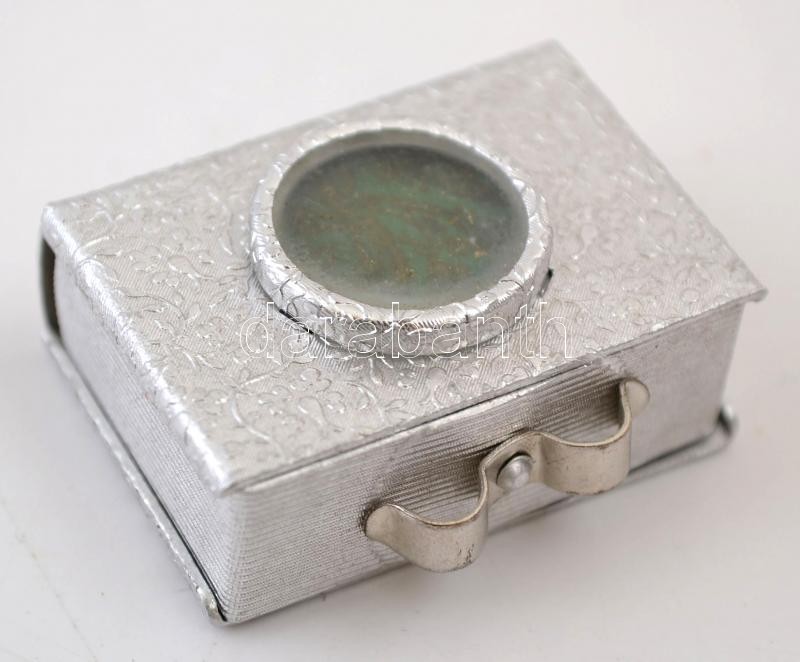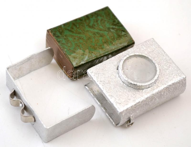 Beschreibung: Korán. Minikönyv, javított papírkötésben, díszes fém tokban, beépített nagyítóval.