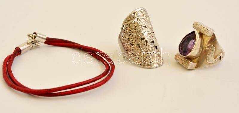 Beschreibung: Ezüst(Ag) gyűrű, 2 db, sérülésekkel, jelzett, méret: 52, 54, bruttó: 19,9 g + bőr karkötő, ezüst szerelékkel