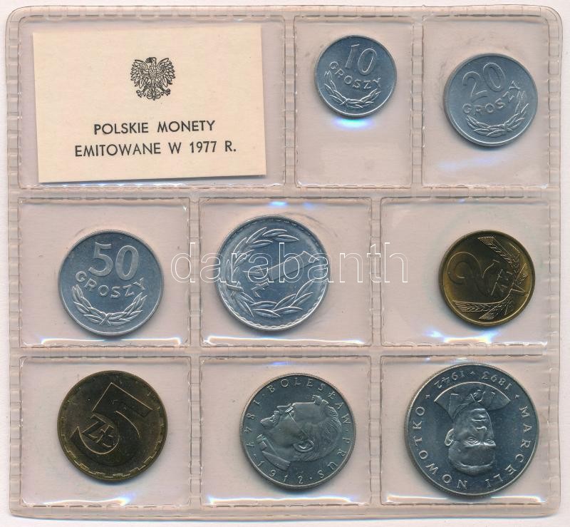 ... https://www.darabanth.com/de/323-Fernauktion/323.0/Numismatik/Auslandische-Kursmunzsatze~2000013/Lengyelorszag-1977-10g-20Zl-8xklf-forgalmi-sor-foliatokban-T1--Poland-1977-10-Groszy-20-~II1788530