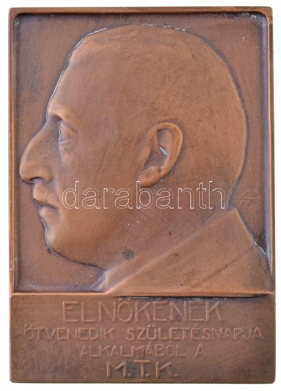 Beschreibung: Szentgyörgyi István (1881-1939) ~1920. "Elnökének ötvenedik születésnapja alkalmából a M.T.K." Br emlékplakett (78x112mm) T:2