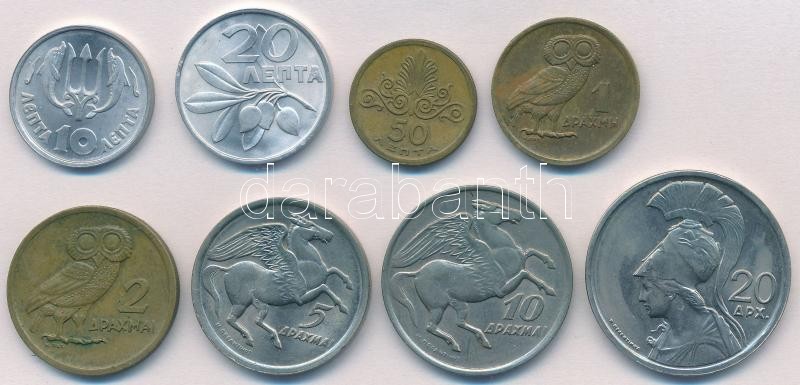 Greece 1973. 10 L... https://www.darabanth.com/de/323-Fernauktion/323.0/Numismatik/Weltweit-Munzen~2000012/Gorogorszag-1973-10l-20D-8xklf-forgalmi-sor-T1--Greece-1973-10-Lepta-20-Drachmai-8xdiff~II1794176