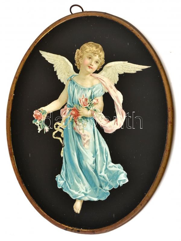 Beschreibung: cca 1900 Angyalt ábrázoló litografált üvegkép. / Litho angel image on glass 23x19 cm