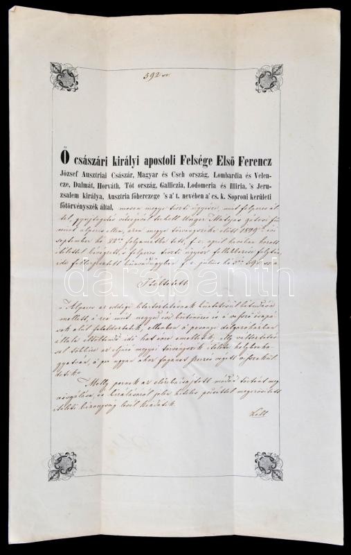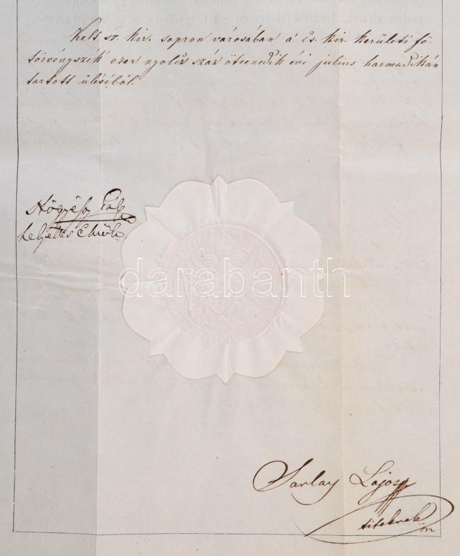 Beschreibung: 1850 Bírósági ítélet Sopronban kelt, Hőgyészi Hőgyészy Pál aláírásával, papírfelzetes viaszpecséttel