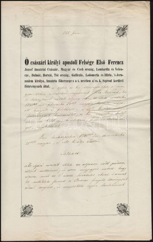 Beschreibung: 1850 Bírósági ítélet Sopronban kelt, Hőgyészi Hőgyészy Pál aláírásával, papírfelzetes viaszpecséttel