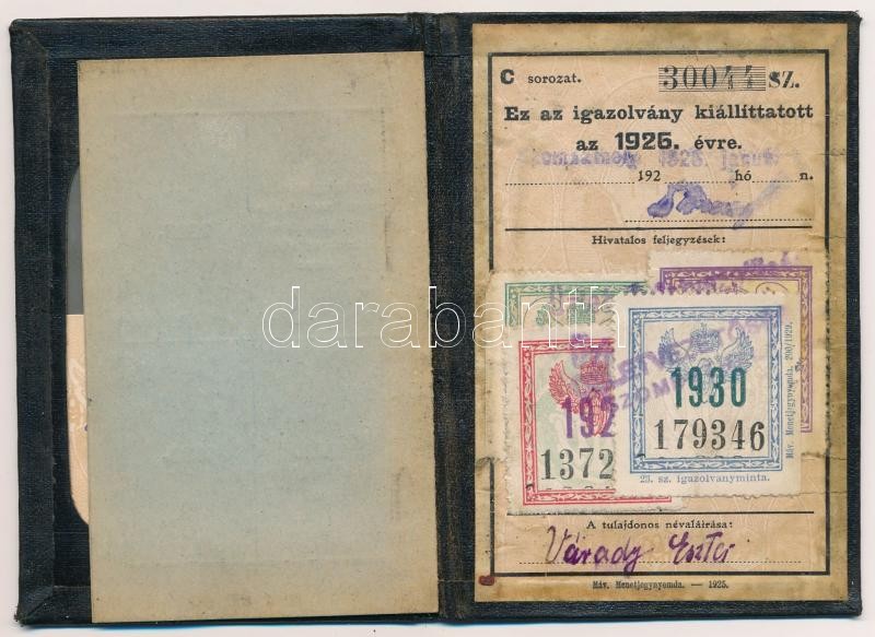 Beschreibung: 1926-1930 Fényképes MÁV félárú jegy váltására jogosító igazolvány, Duna-Száva-Adria Vasúttársaság állandó betétlapjával, érvényesítő bélyegekkel