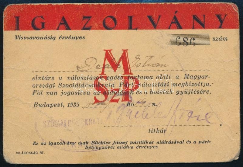 1935 Bp., A Magyarországi Szociáldemokrata Párt igazolványa https://www.darabanth.com/de/324-Fernauktion/324.0/Andere-Sammelgebiete/Dokument~18/1935-Bp-A-Magyarorszagi-Szocialdemokrata-Part-igazolvanya~II1802643