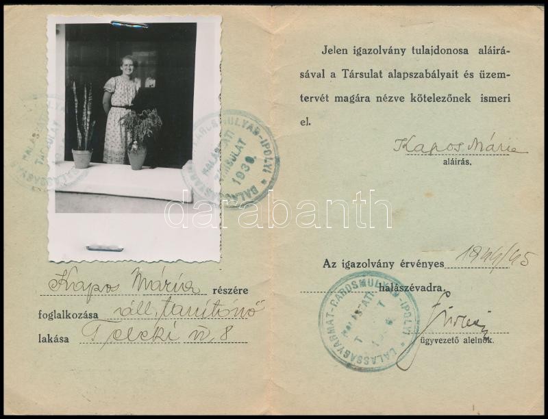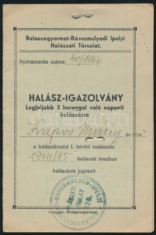 1944 Halász-igazolvány, fényképpel, Balassagyarmat-Rárosmulyadi Ipolyi... https://www.darabanth.com/de/324-Fernauktion/324.0/Andere-Sammelgebiete/Dokument~18/1944-Halasz-igazolvany-fenykeppel-Balassagyarmat-Rarosmulyadi-Ipolyi-Halaszati-Tarsulat~II1798705