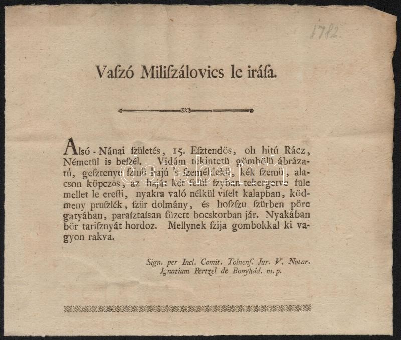 1782 Körözött személy leírása 24x18 cm https://www.darabanth.com/de/324-Fernauktion/324.0/Andere-Sammelgebiete/Drucksachen~30/1782-Korozott-szemely-leirasa-24x18-cm~II1798061