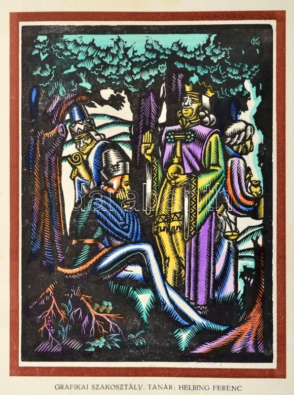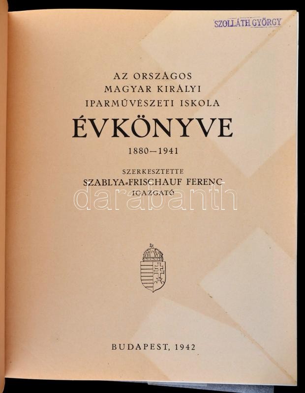 1942 Az Országos Magyar Királyi Iparművészeti Iskola Évkönyve 1880-1941. Szerk.: Szablya-Frischauf Ferenc. Bp., Kir. M. Egyetemi Nyomda, 38+2 p+XLVIII+6 t. Gazdag képanyaggal illusztrálva. Kiadói papírkötés, sérült gerinccel, kötéssel, javított borítóval, aláhúzásokkal, bejelölésekkel. Szolláth György (1927-2009) éremművész névbélyegzőjével.