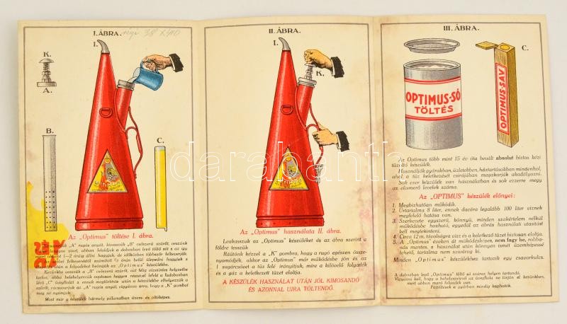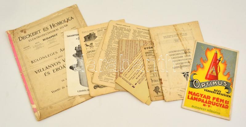 cca 1910-1940 Vegyes árjegyzék és prospektus tétel, 10 db: Optimus kézi tűzoltó készül. Magyar Fém és Lámpaárugyár Rt. Litografált prospektus. Bp.,Magyar Grafikai Műhely. Első Proszniczi Gazdasági Gép- és Gőzmotor-gyár. Wichterle Bp. Gőzmozgonyok, gőzcséplőgépek, Legujabb szab. Gőzmotorok, gőzmotor-cséplőkészletek. Árjegyzék, foltos, 24 p. Deckert és Homolka Elektrotechnikai Gyár. Különleges Árjegyzék. VI. rész: Villanyos világítás és erőátvitel. VII. rész: Vezető- és szigetelő anyagok. Bp.,"Pátria"-ny., 24 p. Papírkötés, szakadozott, kissé hiányos lapszélekkel, borítóval. Kottavásár! Léderer István zeneműkiadó és zeneműkereskedőnél. Árjegyzék. Bp., Klein S.-ny., 2 sztl. lev. Takarítsunk olajat "Retroil" által. Reklám prospektus, 2 sztl. lev. Hajtásnyomokkal, szakadással. Wágner a "Hangszer-király". Árjegyzék, borító nélkül, 3-14 p. "Gépész" szaklap könyv árjegyzéke. Szakadozott, 2 sztl. lev. Vasöntvények. Ferrofix segélyével forraszthatók! Reklám prospektus. Bp., Lukács és Tsai, Községi-ny., hajtásnyomokkal, 2 sztl. lev. Keményforrasztásaihoz (Hartlöthen) kísérelje meg az uj ömlesztő-szer Borfix alkalmazását! Reklám-prospektus. Bp., Lukács és Tsai, Községi-ny., hajtásnyomokkal, 1 sztl. lev. György és Somogyi Vaskereskedés, asztalosáruk szaküzlet árjegyzék kivonata. 1937. augusztus. 42. sz. Bp.,Dr. Antos és Társa-ny., 16 p.