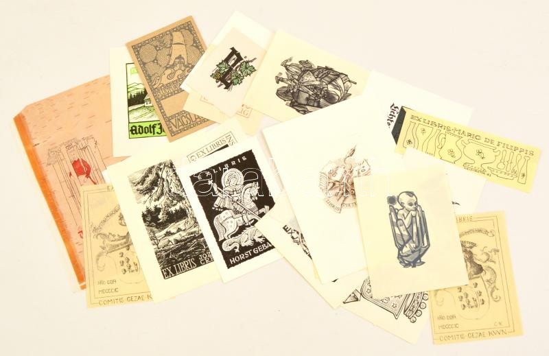 25 db különféle külföldi ex libris (Zbigniew Dolatowski, Tadeusz Szumarsli, Mirjam Kinos, stb.), linó/fametszet/rézkarc, papír, egy részük jelzett a dúcon, különböző méretben