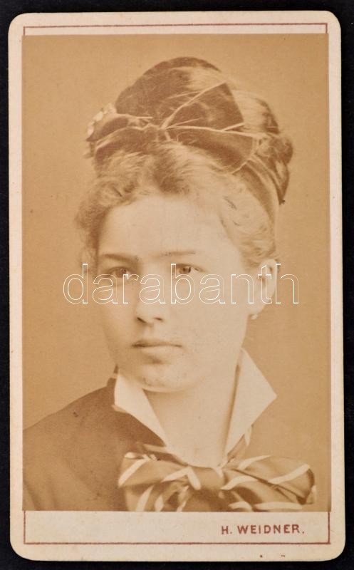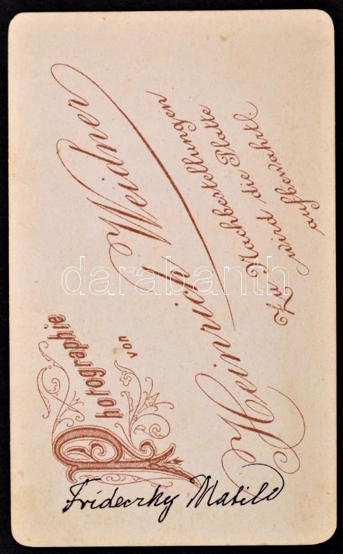 cca 1860-1870 Adorján Lőrincné Frideczky Matild, Frideczky Lajos lányának keményhátú fotója, Heinrich Weidner műterméből, 10x6 cm. Frideczky Lajos (1817-1902) régi Nógrád megyei birtokos család sarja, politikus, előbb Nógrád vármegye al-, majd főjegyzője, országgyűlési képviselő 1848-ban, 1849-ben kormánybiztos, 1867-től a vármegye első alispánja, később a balassagyarmati törvényszék elnöke.